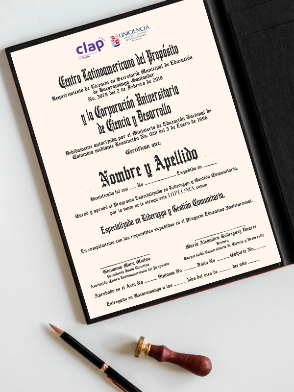 Al culminar nuestro Programa, recibirás el diploma de «Especializado en Liderazgo y Gestión Comunitaria», certificado por CLAP y Uniciencia. Este diploma muestra tu habilidad para liderar y llevar a cabo proyectos sociales que mejoran el desarrollo y la equidad en diferentes comunidades.