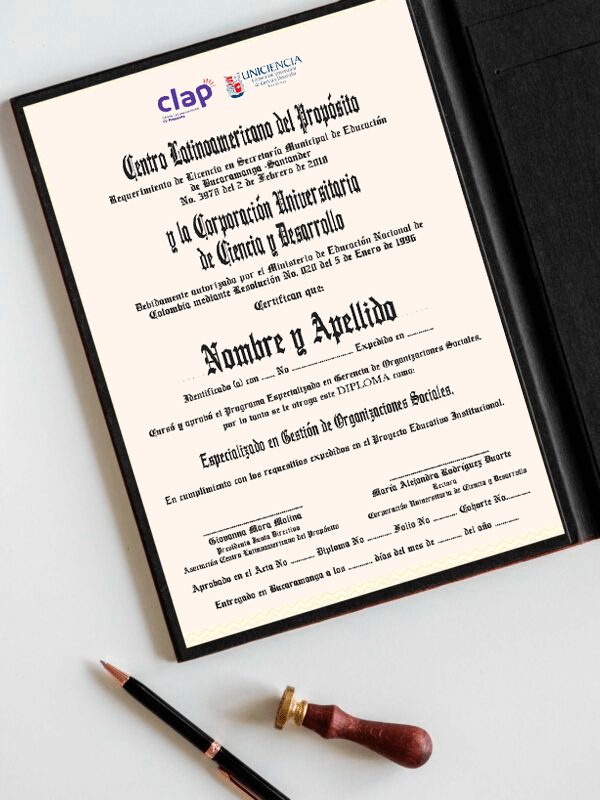 Al terminar el programa, recibirás un diploma de «Especializado en Gestión de Organizaciones Sociales», certificado por CLAP y Uniciencia. Este diploma demuestra que sabes cómo administrar y liderar organizaciones sociales que impacten positivamente en la sociedad. Además, resalta tu preparación en liderazgo, gestión sostenible y habilidades necesarias para dirigir organizaciones sociales exitosas.