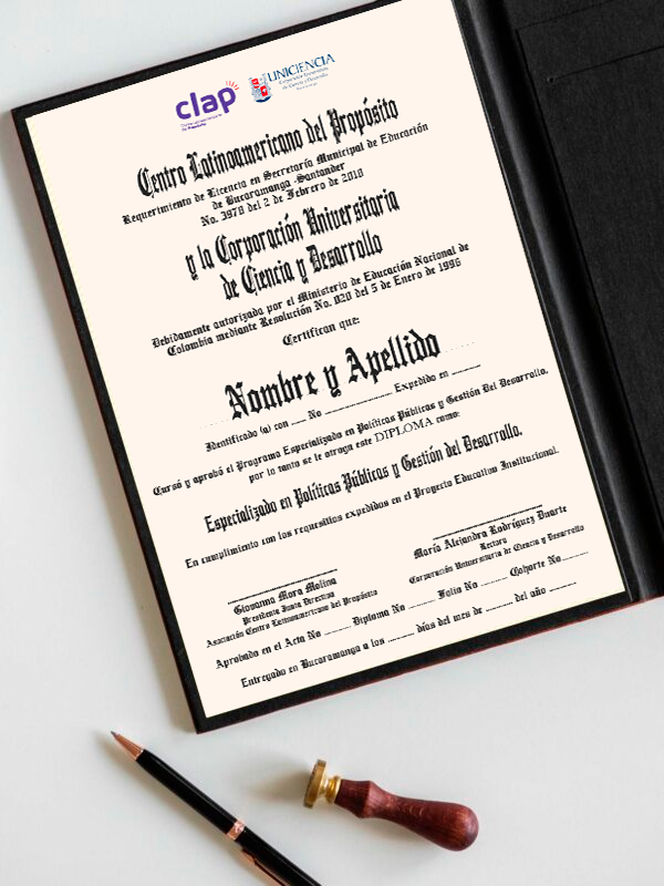 Al culminar nuestro Programa, recibirás un diploma de «Especializado en Políticas Públicas y Gestión de Desarrollo», certificado por CLAP y Uniciencia. Este diploma muestra que puedes liderar la creación y ejecución de políticas efectivas y sostenibles que ayudan al desarrollo de la sociedad.